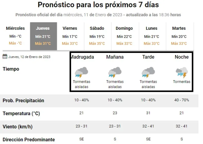 Según datos del Servicio Meteorológico Nacional, este jueves 12 de enero habrá un cielo parcial a mayormente nublado, con mínimas de 21°C y máximas de 31°C.