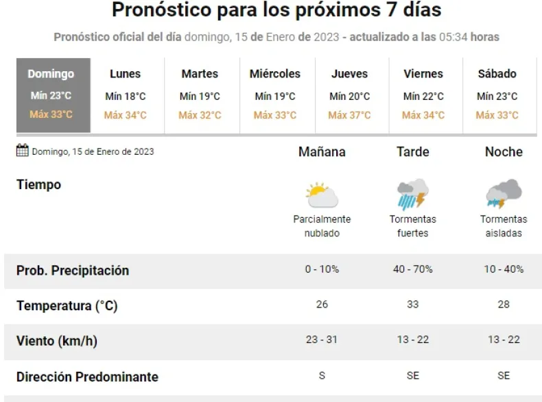 Para mañana lunes, se espera una jornada más calurosa con una máxima de 34°C y continuará vigente la alerta de tormentas. El martes, se espera máxima de 32°C con cielo nublado.