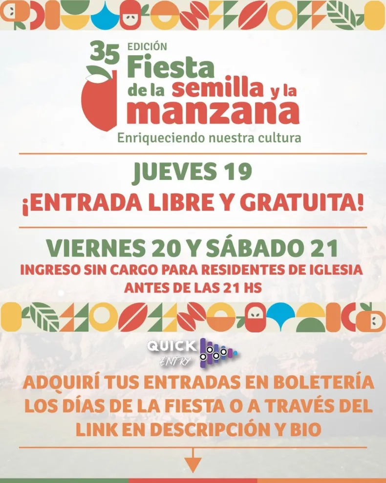 Desde este jueves, el departamento Iglesia vivirá 3 noches a puro espectáculos por la celebración de la Fiesta de la Semilla y la Manzana, con artistas nacionales y provinciales. Además de shows en vivo, el público también podrá disfrutar de puestos gastronómicos, del patio cervecero, puestos de artesanos y mucho más.