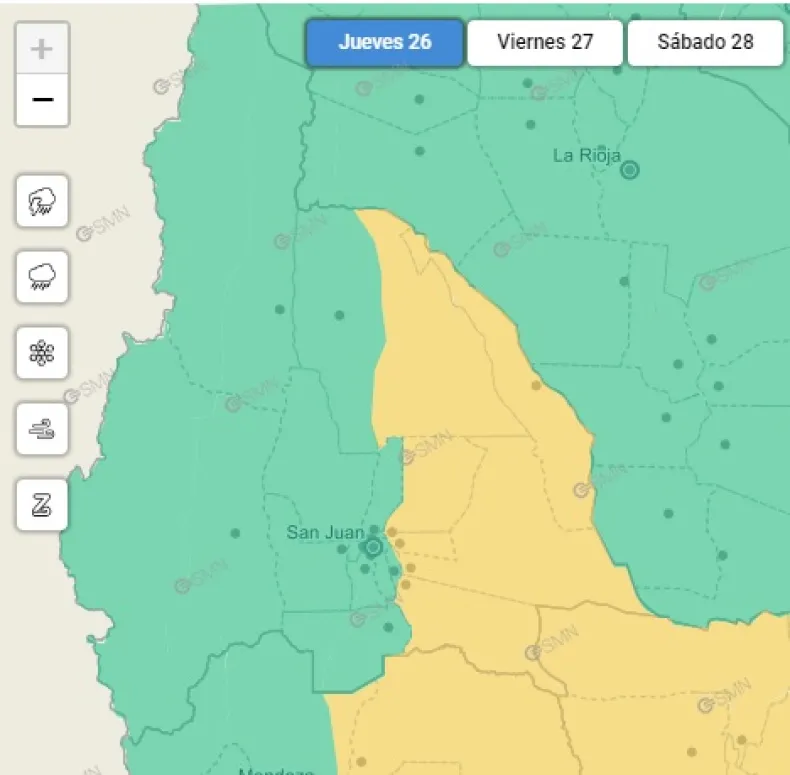 En tanto, las áreas bajo alerta amarilla abarcan el resto de las provincias de Mendoza, San Luis, Córdoba y Buenos Aires.