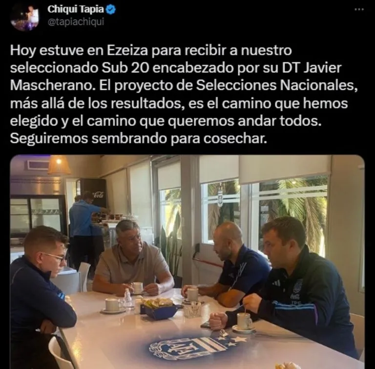 "Hoy estuve en Ezeiza para recibir a nuestro seleccionado Sub 20 encabezado por su DT Javier Mascherano. El proyecto de Selecciones Nacionales, más allá de los resultados, es el camino que hemos elegido y el camino que queremos andar todos. Seguiremos sembrando para cosechar", escribió el presidente de AFA.