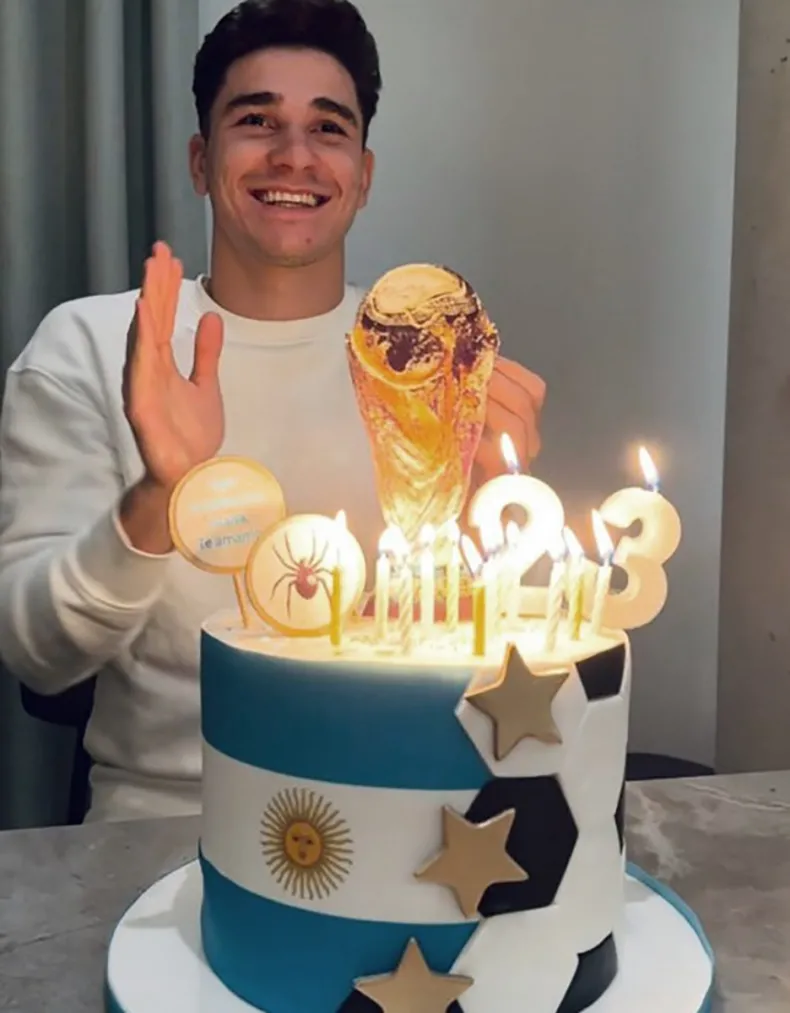Junto a su novia, sus familiares y sus amigos más íntimos, Julián Álvarez festejó su cumpleaños 23 en Inglaterra con una torta mundialista, decorada con la Copa del Mundo, las tres estrellas en alusión a las tres copas del mundo conseguidas por la Albiceleste en su historia y la bandera argentina en una mitad con la otra formando una pelota de fútbol.
