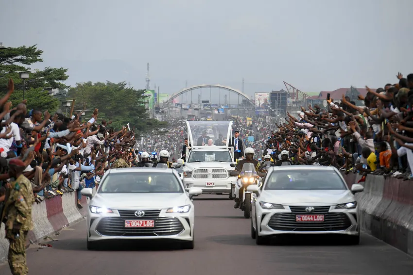 Miles de personas le aclamaron a Francisco en su papamóvil desde el aeropuerto hasta la capital, Kinshasa. Algunos se separaron para perseguir a su convoy, mientras otros coreaban y ondeaban banderas.