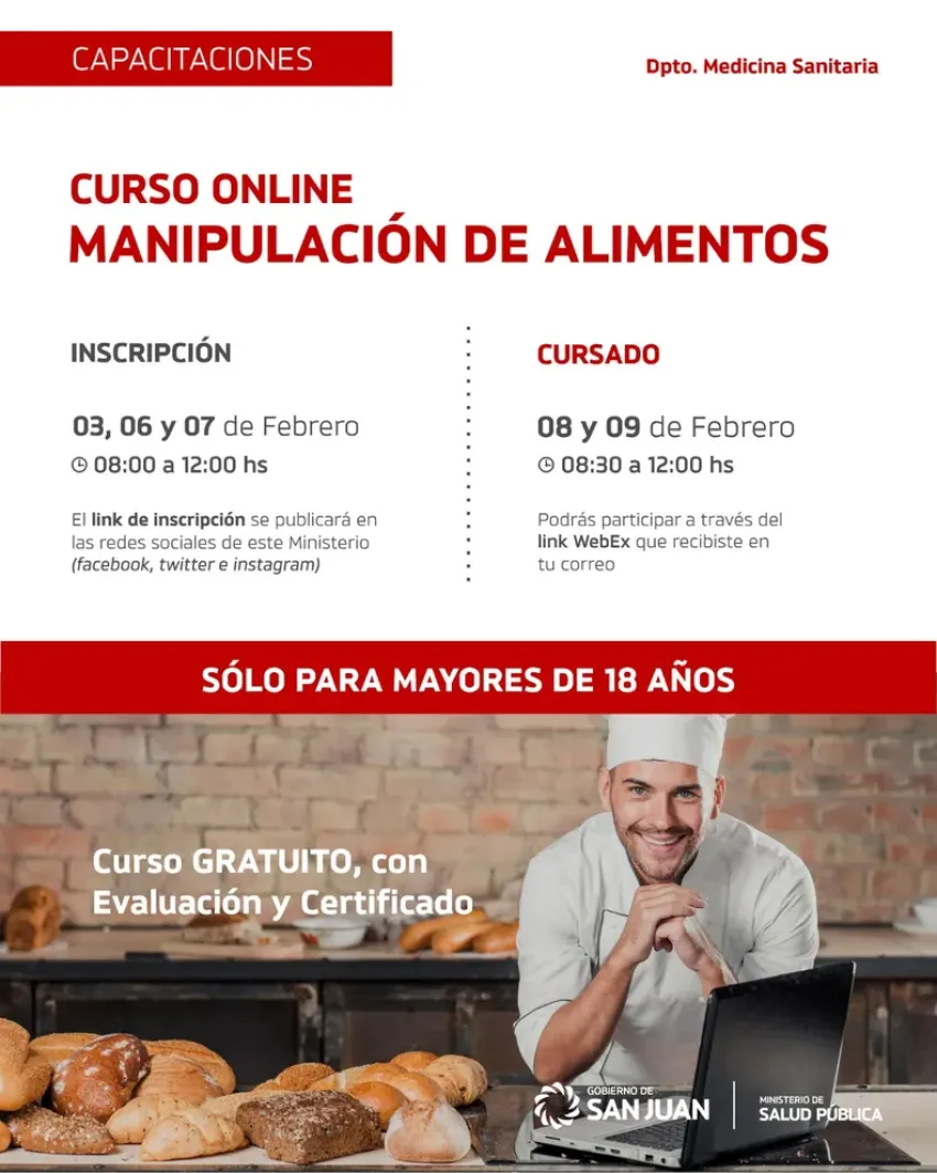 El departamento de Medicina Sanitaria del Ministerio de Salud. Invita a todas las personas que quieran inscribirse del nuevo curso online y gratuito de manipulación de alimentos, que se dictará entre los días 8 y 9 de febrero desde las 8.30 a 12.00 y se podrá acceder al mismo con el link WebEx que cada uno de los inscriptos recibirá en su cuenta de correo electrónico..