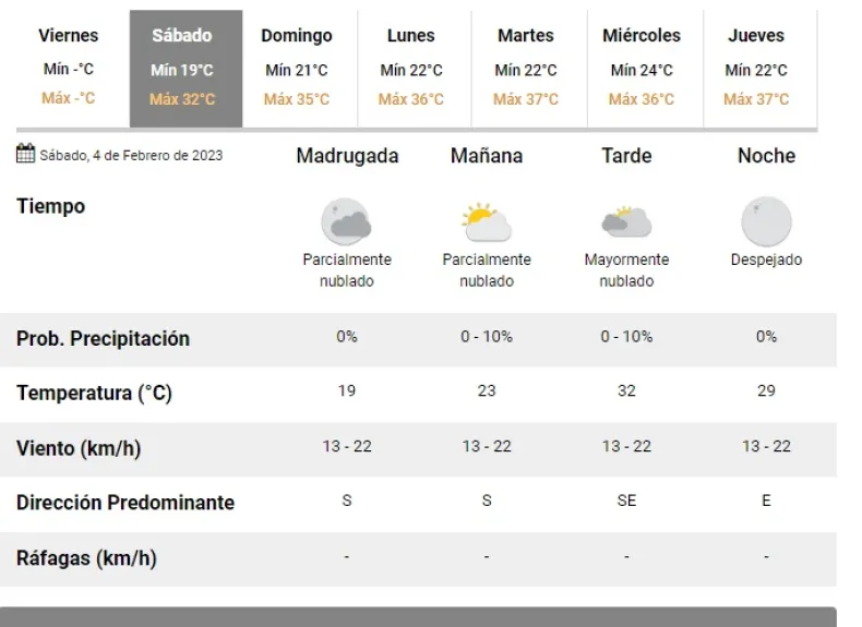 Para mañana domingo la temperatura llegará a los 35 grados con cielo despejado. En tanto el lunes, cuando inicie la semana volverá a subir la máxima y se ubicará en 36°C.