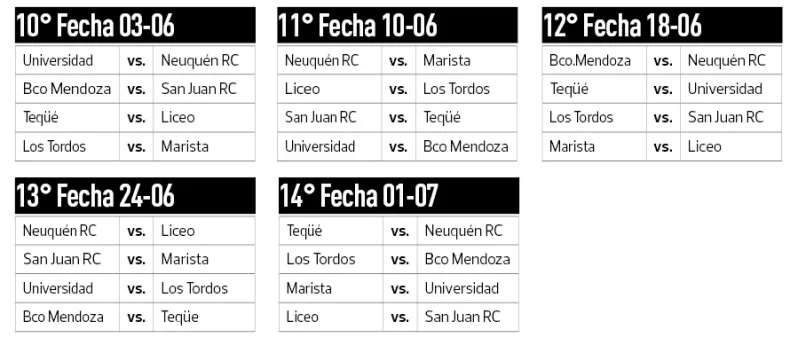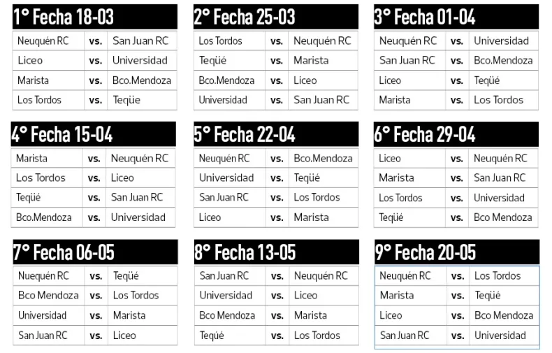 Son 5 equipos de Mendoza: Liceo, Marista, Los Tordos, Teqüé y Banco Mendoza. El restante equipo es el Neuquén Rugby Club.