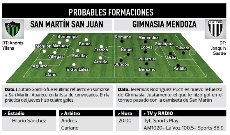 Después de cuatro meses, San Martín juega en Concepción por la Primera Nacional recibiendo a las 20.00 a Gimnasia de Mendoza, en el marco de la segunda fecha de la Zona A. Dos cambios introduce el técnico del equipo sanjuanino.