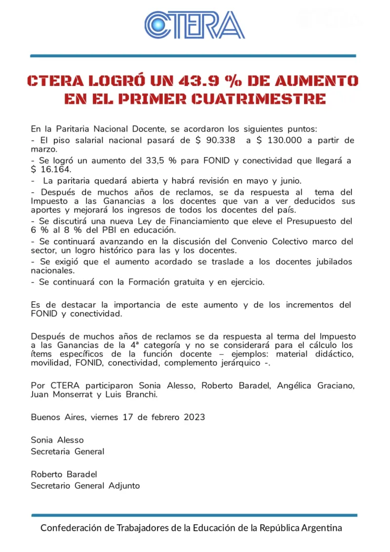 Por su parte, Luis Lucero, secretario general de UDAP explicó a este medio que ese "es el valor del piso salarial para el cargo testigo del maestro de grado, sin radio y sin antigüedad, en jornada simple".