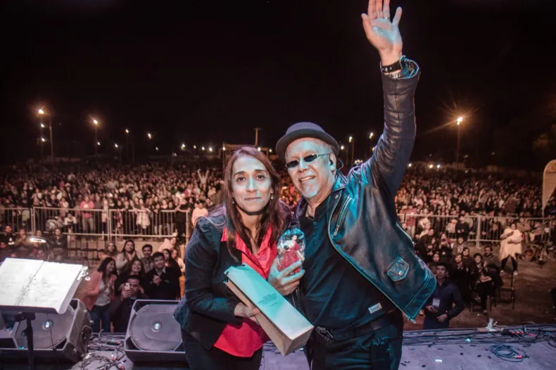 Asimismo, la intendenta del departamento, Romina Rosas, subió al escenario y le regaló al Rey Pelusa una imagen de la Difunta Correa, como un destacado recuerdo de la provincia y de las tierras de Vallecito.