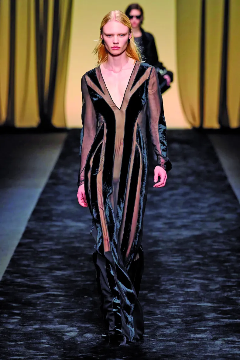 Cavalli apostó a texturas y estampados print, combinando leopardo con flecos o plumas brillantes, sedas drapeadas con cuero y pieles, sumando asimetrías y transparencias. Todo junto es mucho, tal vez por separado hubiera sido una mejor opción. De todas formas hay vestidos asimétricos que son exquisitos, como uno en color plata o de leopardo llevado al rosa malva. Tuvo un segmento de prendas en color negro donde tejidos, encajes y transparencias fueron los protagonistas, con uno de los mejores vestidos de la temporada en negro, mega escotado, con un aplique en piedras uniendo escote y falda, sin espalda.