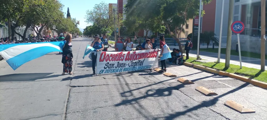 Desde las 8:30 de este jueves, algunos educadores se apostaron sobre calle Ignacio de la Roza para realizar otra protesta en el 12do día de paro. Además, también llegaron algunos docentes de departamentos alejados para apoyar la marcha.