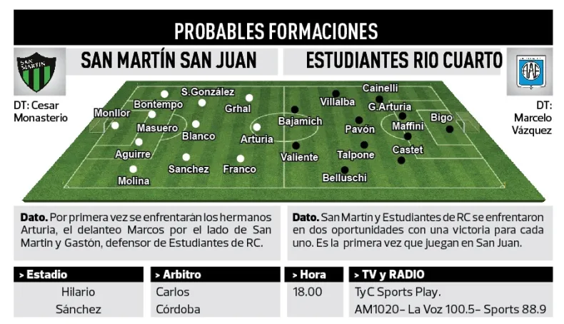 San Martín recibe a Estudiantes de Río Cuarto a las 18.00 en el marco de la octava fecha de la Primera Nacional. Hoy se produce el debut oficial de Cesar Monasterio como DT del Verdinegro.