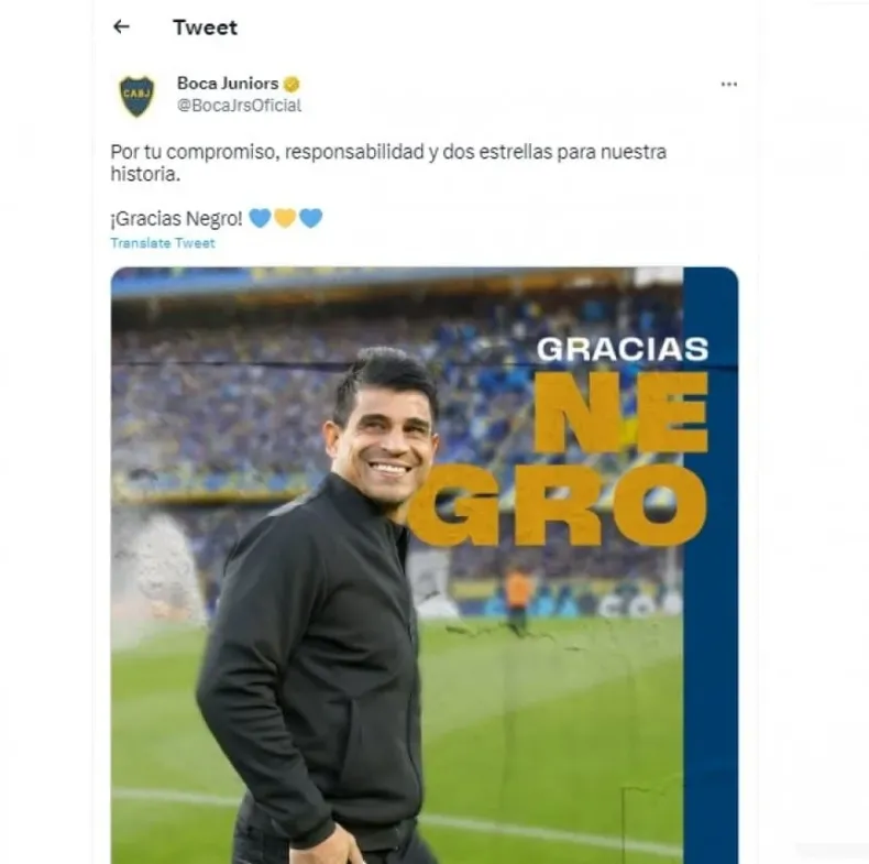 El club publicó en las redes sociales una imagen de Ibarra sobre el campo de juego de La Bombonera junto a la leyenda "gracias, Negro". Y agregaron: "Por tu compromiso, responsabilidad y dos estrellas para nuestra historia".