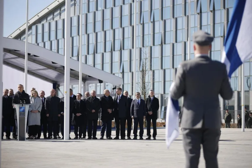 La bandera de Finlandia, una cruz azul sobre un fondo blanco, se izó junto con la de los otros 30 miembros de la alianza mientras una banda militar tocaba bajo un sol brillante.