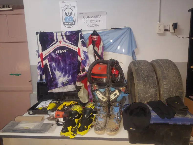 Con los datos aportados, los policías llegaron al lugar señalado y encontraron, entre otros objetos: una motocicleta, dos bicicletas, ambas de rodado 29, cubiertas, una moto guadaña, una pala, una aspiradora, una cubierta de moto, botas, ropa de alta montaña para practica de endurismo, una caladora con sus accesorios, un taladro, una amoladora, 4 cámaras de motocross, baterías, aerosoles, lubricantes y lubricantes.