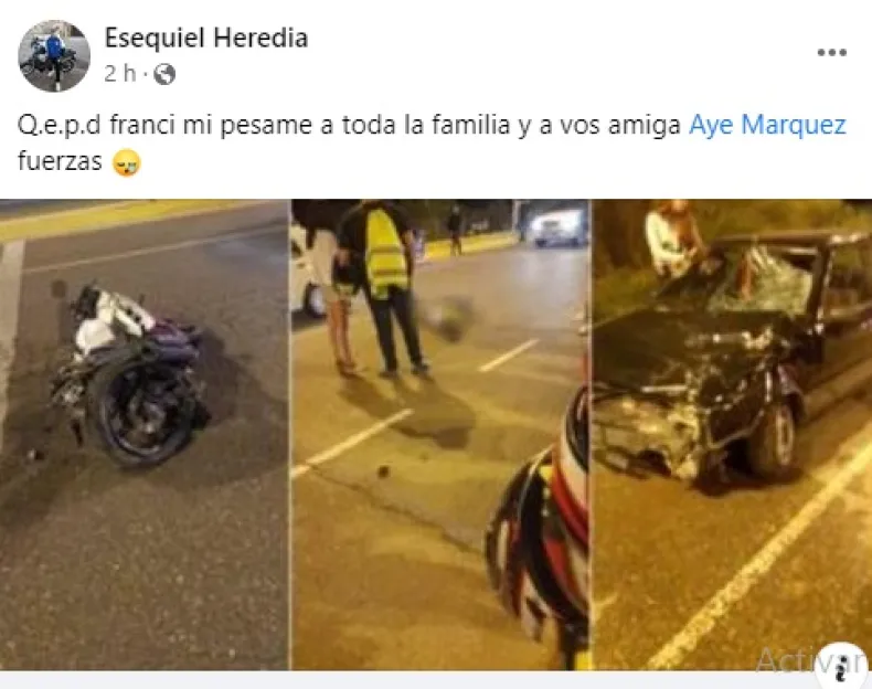 Mientras avanzan las horas del accidente que se cobró la vida de un motociclista en Rivadavia, en las redes se multiplican los mensajes de dolor por su fallecimiento. Se trata de Francisco Márquez, de 22 años, quien murió en el acto luego de chocar a bordo de su moto Yamaha 150cc. contra un Fiat Uno en la Ruta 60, a la altura del Camping El Pinar.