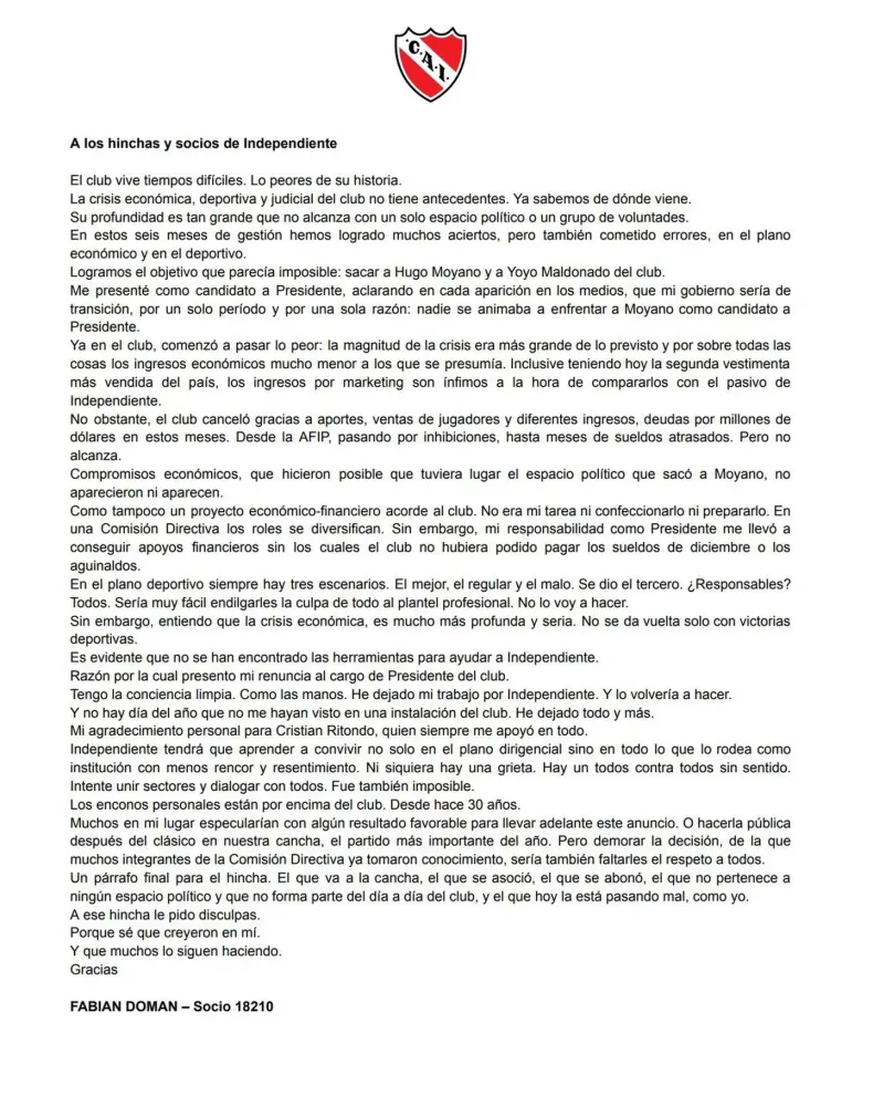 En medio de un clima tenso que se vive en el club debido a la mala campaña del plantel de Primera División y a una gran cantidad de deudas dejadas por las administraciones anteriores, Fabián Doman renunció a la presidencia de Independiente.