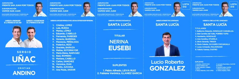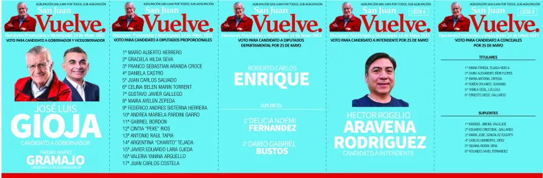 En San Juan por Todos, el sublema Vamos San Juan lleva un azul clásico mientras que San Juan Vuelve trabaja otro tono con hincapié en el rojo de Vuelve.