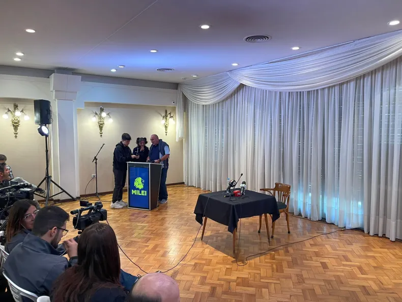 Los seguidores del candidato a presidente por Libertad Avanza esperan tranquilos en las puertas del Club Social San Juan.