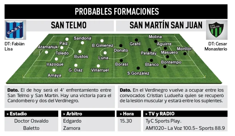 San Martín visita al candombero San Telmo en el marco de la 13° fecha de la Primera Nacional. El Verdinegro viene de una sufrida victoria y en su última salida perdió mal en Tucumán.