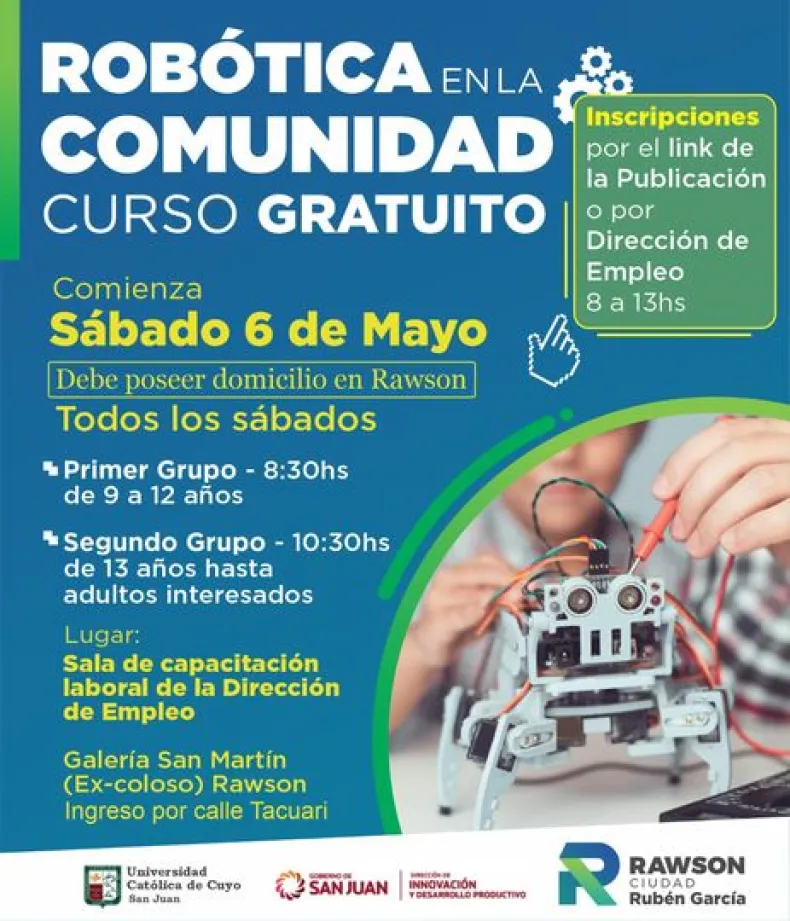 Este sábado 6 de mayo, comenzará a dictarse el curso de robótica para chicos y para personas mayores de edad, capacitación que tendrá como punto de encuentro el salón donde funciona la Dirección de Empleo de la Municipalidad de Rawson, ubicada en la galería San Martín ex Coloso.