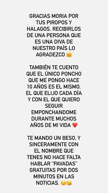 Inmediatamente el futbolista, furioso por los dichos, hizo una publicación en su Instagram donde le "agradeció" a la vedette. "Gracias Moria por tus piropos y halagos. Recibirlos de una persona que es una diva de nuestro país lo agradezco. También te cuento que el único pongo que me pongo hace 10 años es el mismo, el que elijo cada y con el que quiero seguir emponchándome durante muchos años de mi vida", arrancó diciendo.