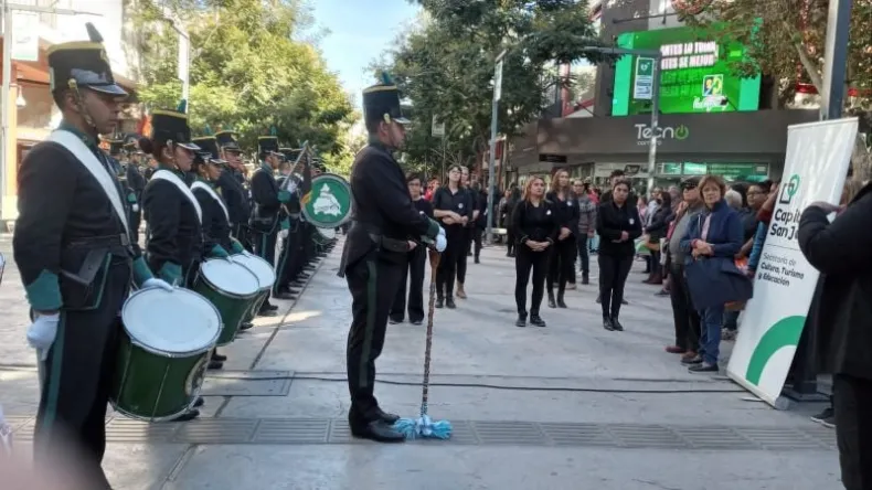 Por eso es que, los integrantes de la Banda Música de la Policía de San Juan y de la Banda de Música del RIM 22 del Ejército Argentino, entonaron las estrofas del himno ante la mirada y la emoción de los sanjuaninos que pasaban, tanto por el cruce de las peatonales Tucumán y Rivadavia, como los que transitaban a esa hora por la vereda de la Catedral sanjuanina.