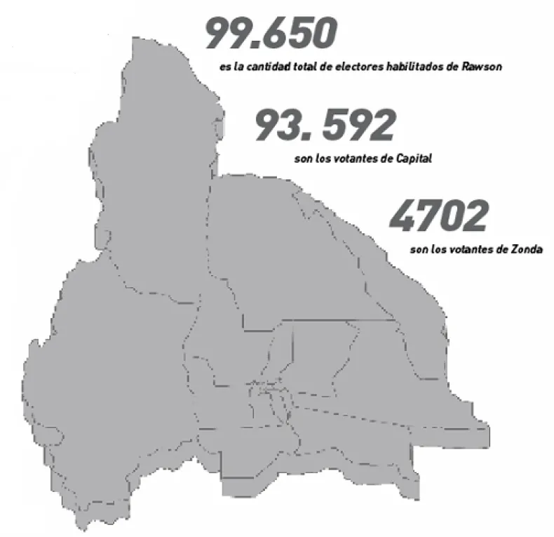 Si bien cada jurisdicción tiene sus datos particulares, entre los 5 departamentos que integran el Gran San Juan, reúnen más del 64% de los electores. Siendo un total de 387.739 votantes entre todos los de Santa Lucía, Rivadavia, Chimbas, Rawson y Capital.