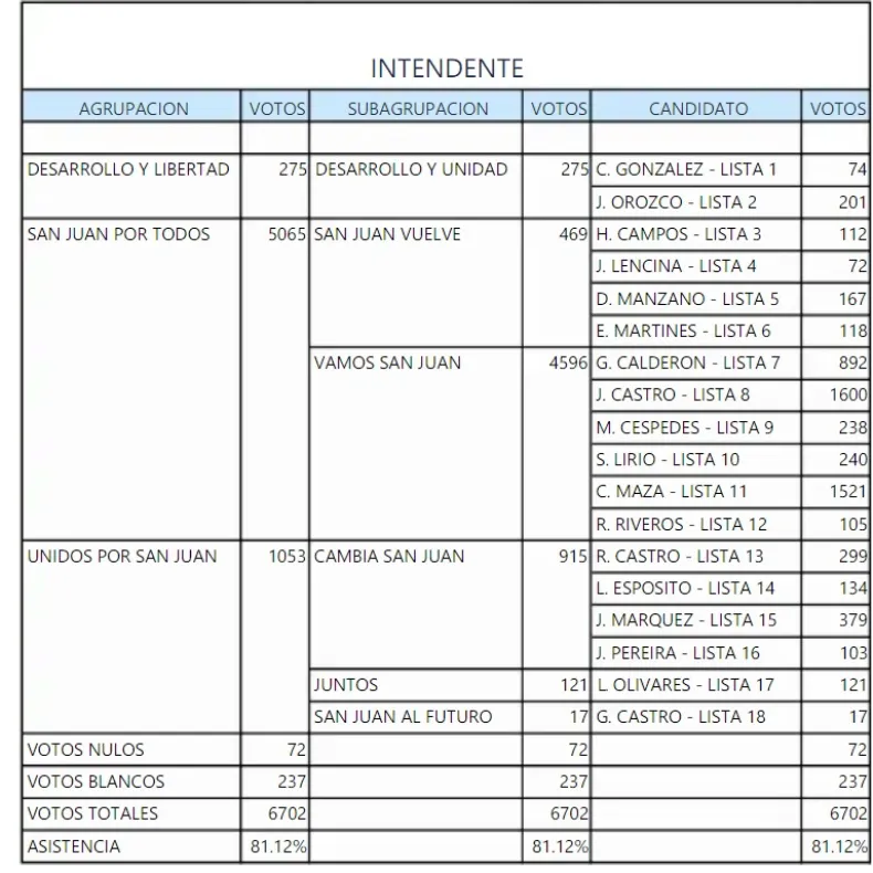 Finalmente, durante la tarde de este jueves se confirmó que el justicialista José Castro ganó las elecciones por 79 votos. Castro logró 1600 sufragios y Maza Pezé 1521. Tercero se ubicó Calderón, también de la subagrupación Vamos San Juan, al que se le contabilizaron 892 votos.