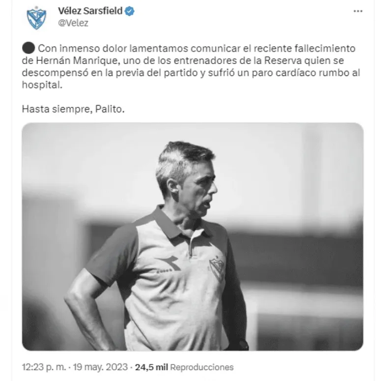 "Con inmenso dolor lamentamos comunicar el reciente fallecimiento de Hernán Manrique, uno de los entrenadores de la Reserva quien se descompensó en la previa del partido y sufrió un paro cardíaco rumbo al hospital. Hasta siempre, Palito", publicó en sus redes sociales Vélez.