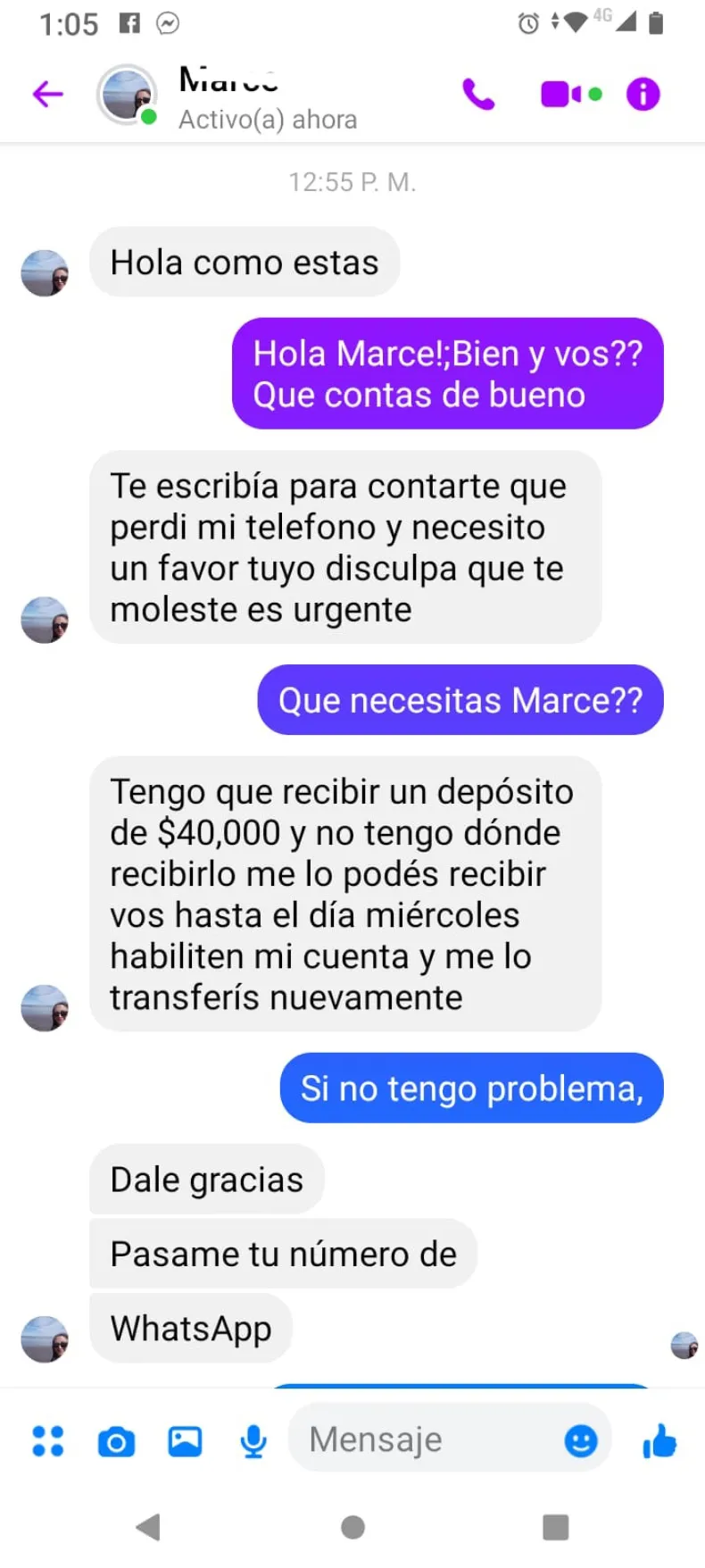 El estafador, se hizo pasar por un familiar y le envió un mensaje por Messenger. En el texto le decía que había perdido el teléfono y que quería que le hiciera un favor.