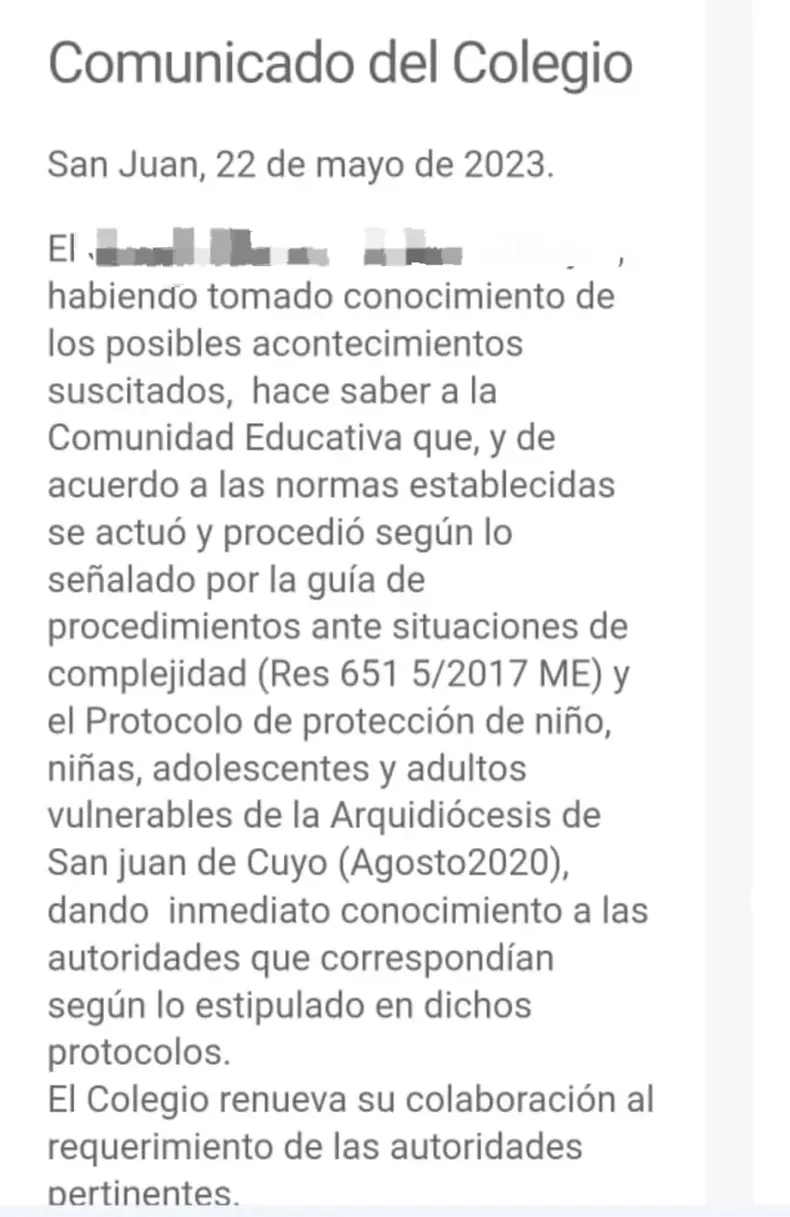 Además, destacó: "El caso de abuso habría ocurrido dentro del establecimiento, por eso desde la institución se pone a disposición para que la justicia investigue".