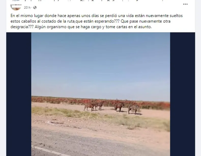 "En el mismo lugar donde hace apenas unos días se perdió una vida están nuevamente sueltos estos caballos al costado de la ruta, qué están esperando??? Que pase nuevamente otra desgracia??? Algún organismo que se haga cargo y tome cartas en el asunto", publicó en su Facebook personal.