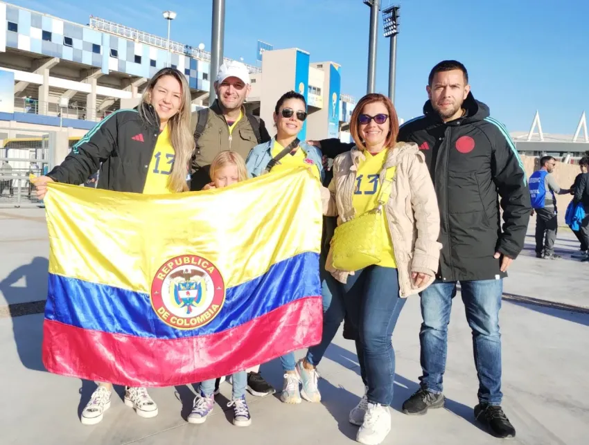 Un grupo de colombianos festejaron en el Estadio Bicentenario San Juan el triunfo de su selección ante Eslovaquia por 5 a 1, victoria que les permite clasificar a los cuartos de final del Mundial Sub 20.