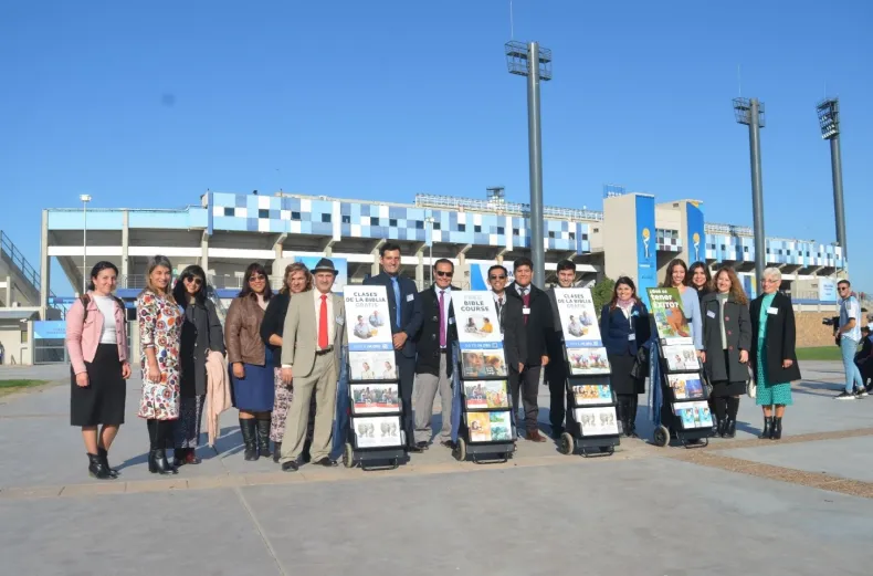 En inmediaciones de la cancha, se dispuso de decenas de expositores con publicaciones bíblicas gratuitas, muchas de ellas en el idioma natal de muchos visitantes.