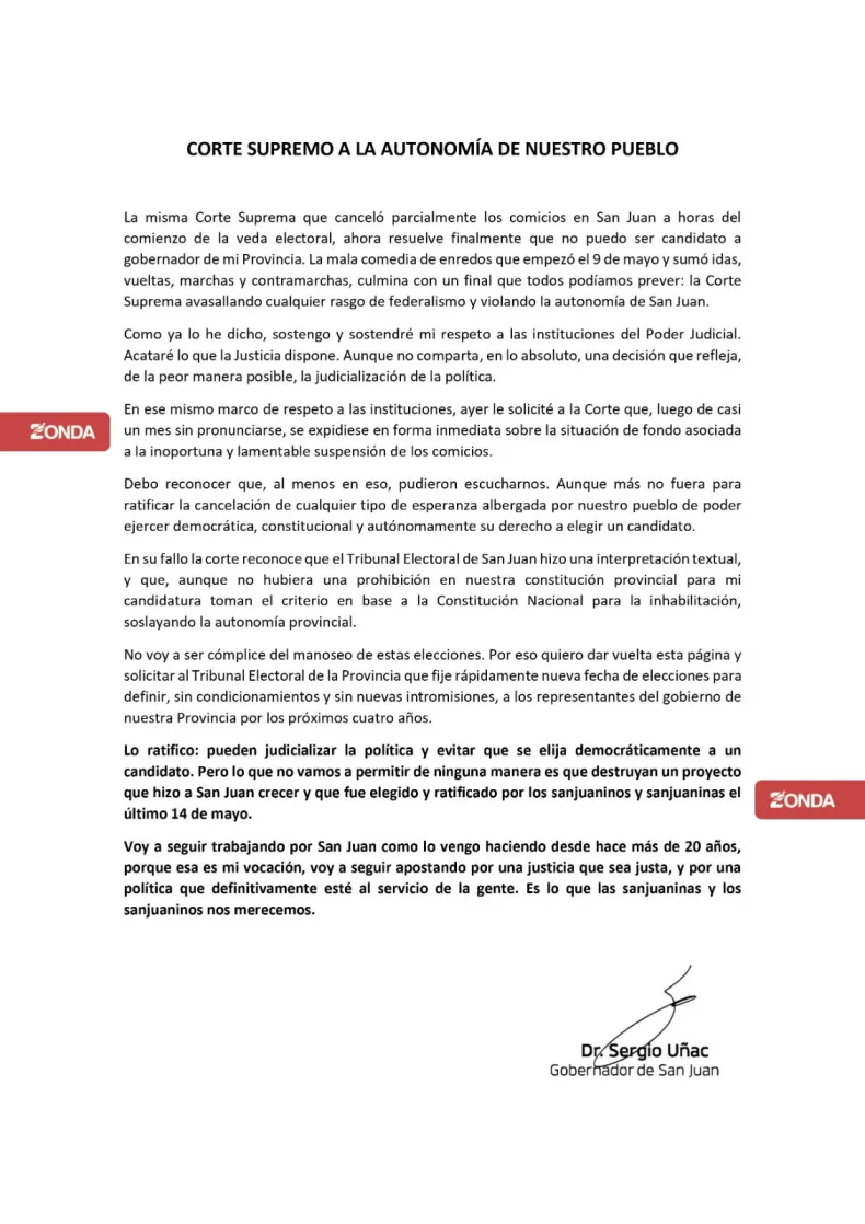 Ya previendo la situación, Uñac dijo que "la misma Corte Suprema que canceló parcialmente los comicios en San Juan a horas del comienzo de la veda electoral, ahora resuelve finalmente que no puedo ser candidato a gobernador de mi Provincia".