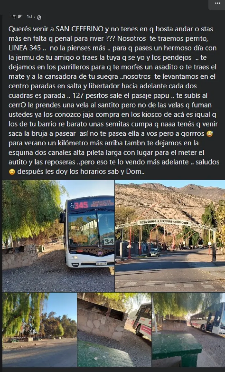 "¿Querés venir a San Ceferino y no tenés en qué bosta andar o estás más en falta que penal para River? Nosotros te traemos, perrito, línea 345 (sic)", comenta Carrizo en su posteo. Con su estilo singular, destaca la comodidad del servicio y las paradas estratégicas en el centro de la ciudad sanjuanina para llegar.