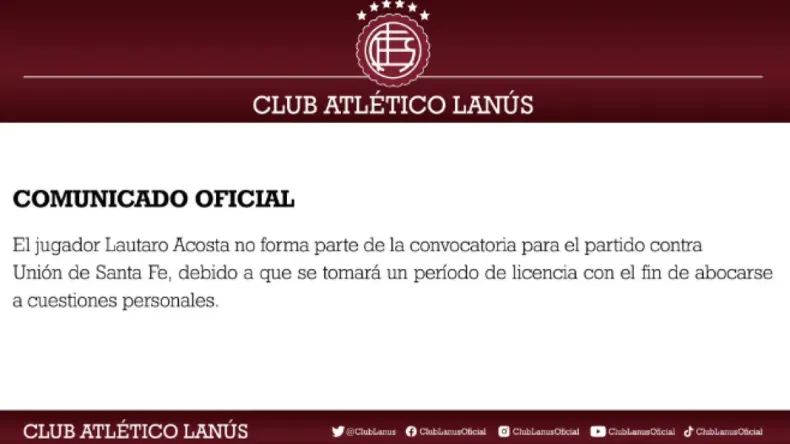 Lautaro Acosta es licenciado de Lanús con un insólito comunicado