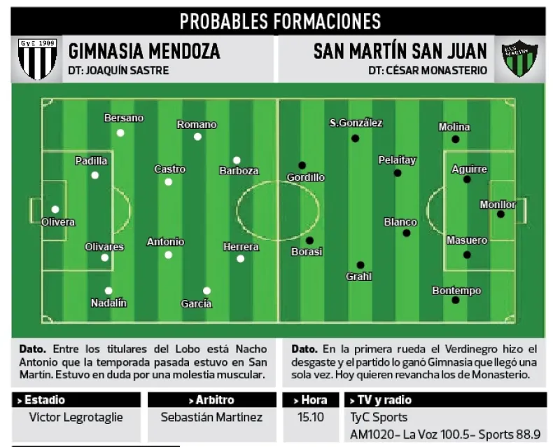 San Martín visita a Gimnasia de Mendoza a las 15.10 televisado por TYC Sports. Luego de la clasificación de la Copa Argentina el Verdinegro se enfoca en el torneo donde esta segundo.