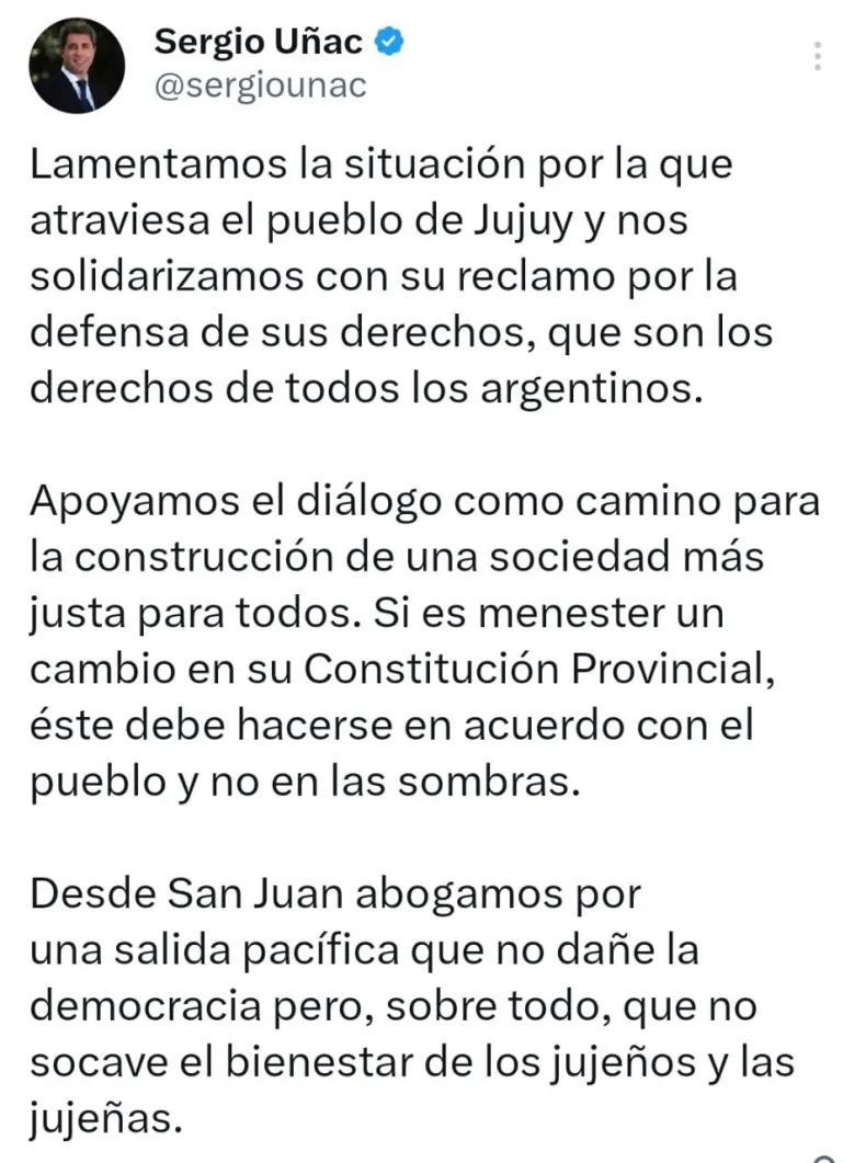 "Lamentamos la situación por la que atraviesa el pueblo de Jujuy y nos solidarizamos con su reclamo por la defensa de sus derechos, que son los derechos de todos los argentinos", manifestó Uñac que, de esta forma, apunta contra el mandatario radical Gerardo Morales.