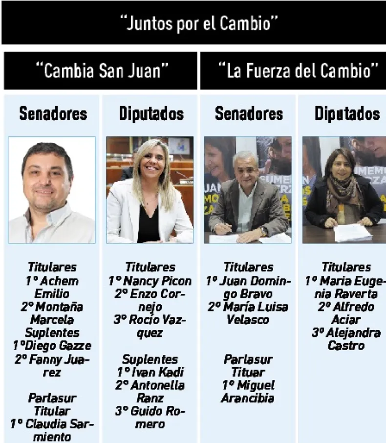 Por su parte, la oposición, precisamente, Juntos por el Cambio se dividió en razón de los candidatos presidenciales. Por un lado, Cambia San Juan, que va por Horacio Rodríguez Larreta, mientras que La Fuerza del Cambio apuesta por Patricia Bullrich.