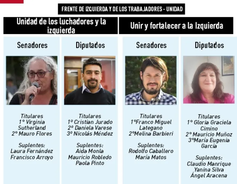 En la Izquierda, en cambio, si bien para las elecciones provinciales optaron por unidad, en esta ocasión se dividen los propios integrantes de la fórmula candidata a Gobernador y Vice, respectivamente. De modo que forman la lista denominada ‘Unidad de los luchadores y la izquierda’, con Cristian Jurado al frente; y la de ‘Unir y fortalecer a la Izquierda’, con Gloria Cimino.