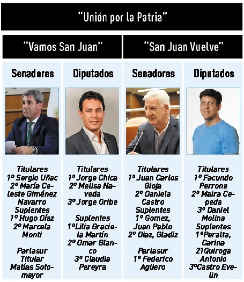Las definiciones se dieron en el marco de negociaciones hasta último minuto, sobre todo, por parte del oficialismo, ya que a nivel nacional, Unión por la Patria optó por la unidad, pero en San Juan no estuvieron de acuerdo y fueron separados con Vamos San Juan, que tiene a Uñac y Chica como referentes; mientras que San Juan Vuelve lleva a Juan Carlos Gioja y Daniela Castro al frente.