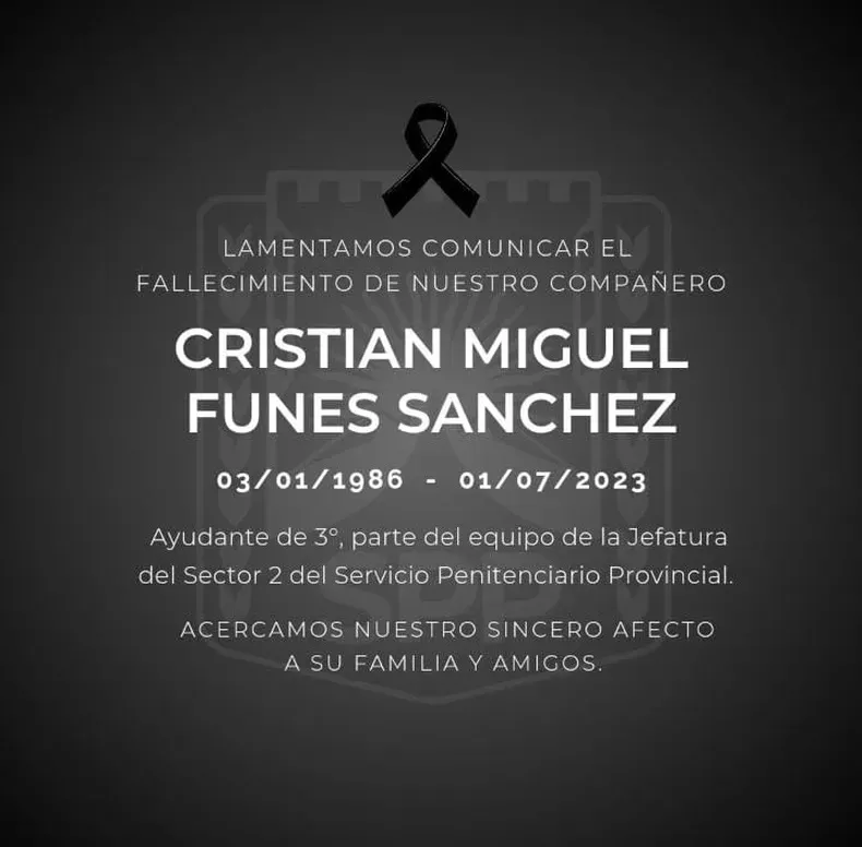El Servicio Penitenciario Provincial emitió un comunicado oficial lamentando el fallecimiento de su compañero Cristian Miguel Funes Sánchez. Funes se desempeñaba como Ayudante de 3º y formaba parte del equipo de la Jefatura del Sector 2 del Servicio Penitenciario. La institución envió su más sentido pésame a la familia y amigos del penitenciario fallecido.
