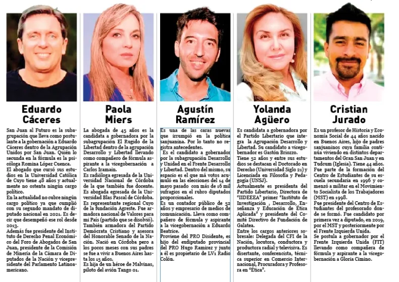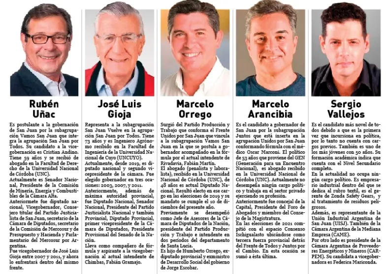 El resto anhela llegar a ese sitial por primera vez, aunque algunos ya tuvieron intentos previos como el candidato de la subagrupación Cambia San Juan de la Agrupación Unidos por San Juan, Marcelo Orrego, principal oponente al oficialismo.