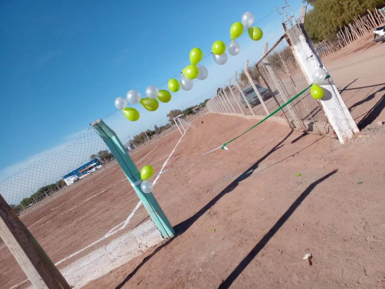 Las mujeres de la zona con doña Verónica Castro a la cabeza se encargaron de armar el cotillón, cortar papelitos y dejar la cinta lista para que los propios protagonistas la corten al ingresar al campo de juego. No tiene riego por aspersión, le sobra tierra y algunas piedritas que quedaron, pero es la casa del Club Atlético Bermejo, el mismo que tiene el escudo de Banfield, el de primera de AFA.