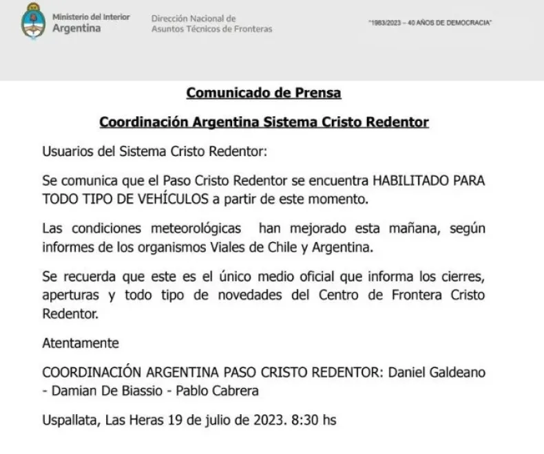 La Coordinación del Paso Internacional Cristo Redentor anunció este martes que el corredor ha sido habilitado para la circulación de todo tipo de vehículo en ambos sentidos, a pesar de las adversas condiciones climáticas que afectan la zona.