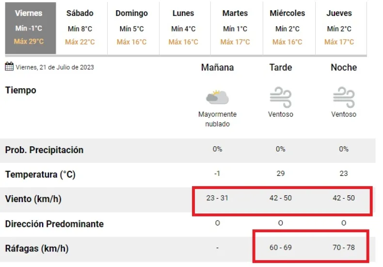 Asimismo, el viento Zonda se manifestará con velocidades que oscilarán entre los 35 y 60 km/h, con ráfagas que pueden superar los 80 km/h. Esta situación puede causar una reducción importante de la visibilidad debido a la presencia de polvo y tierra en suspensión, lo que podría afectar la conducción y el tráfico por las calles de la provincia.