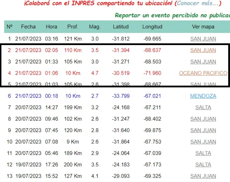 Durante la madrugada de este viernes 21 de julio, se registraron dos sismos en la provincia de San Juan. Según informaron los datos del Instituto Nacional de Prevención Sísmica (Inpres).