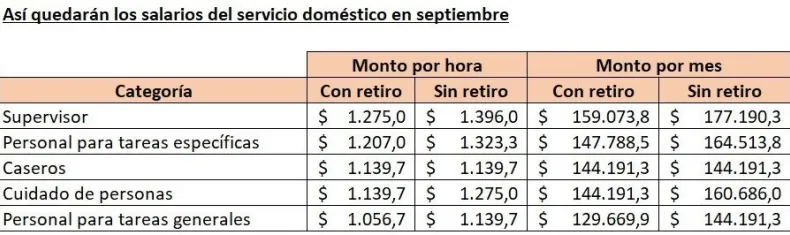 El personal para tareas específicas hoy gana $888 por hora con retiro y $973 por hora sin retiro. Los ingresos aumentarán a $1.065 y $1.167,6 respectivamente en julio, a $1.136 y $1.245,4 en agosto y a $1.207 y $1.323,3 en septiembre.
